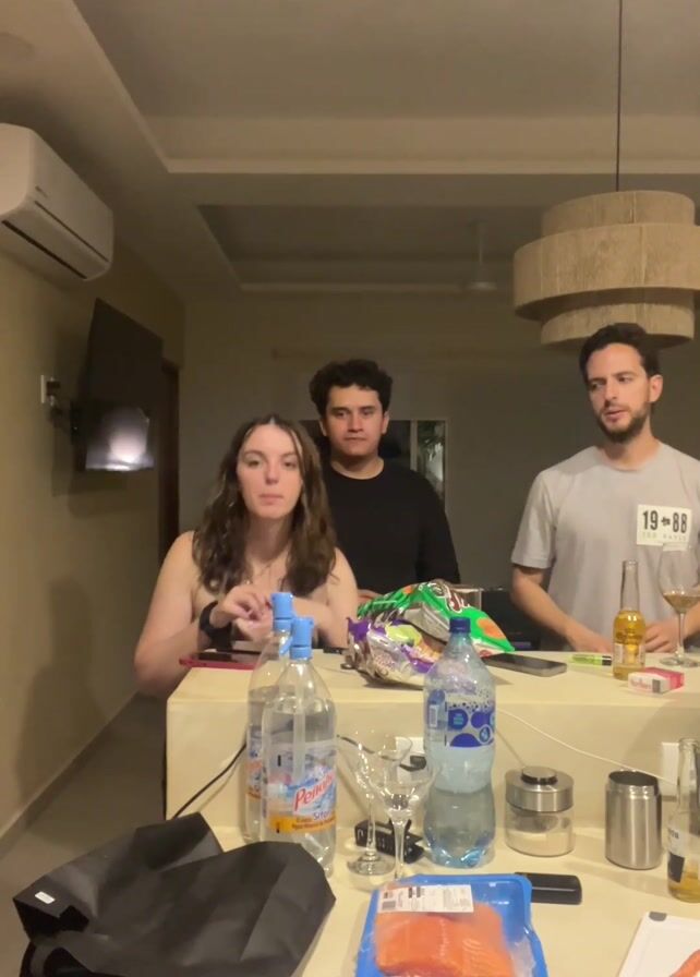 Four people are behind a counter in an indoor space. A woman in a black top and white shorts enters frame left and joins the group, who all perform arm movements together. On the counter are bottled water, salmon, chips, drinking glasses, and other objects. An air conditioner is visible on the wall. A light fixture hangs from the ceiling. A television is visible in the background.
