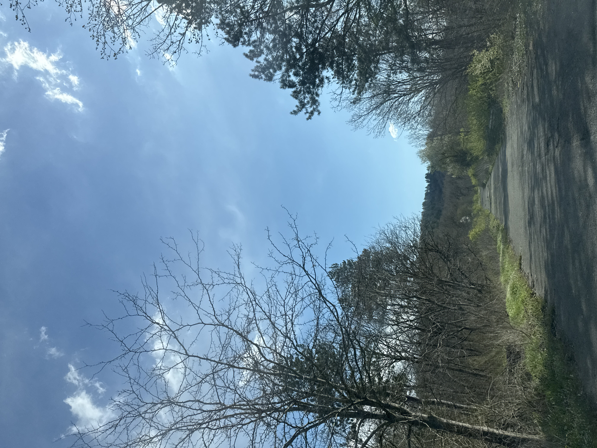 The image captures a section of road in Atiya, Bulgaria, with a view directed upwards. The sky is predominantly blue with scattered white clouds. Framing the sky are trees; some are bare-branched, while others display green foliage. A section of asphalt road runs alongside greenery, suggesting a rural or semi-rural location within the city.