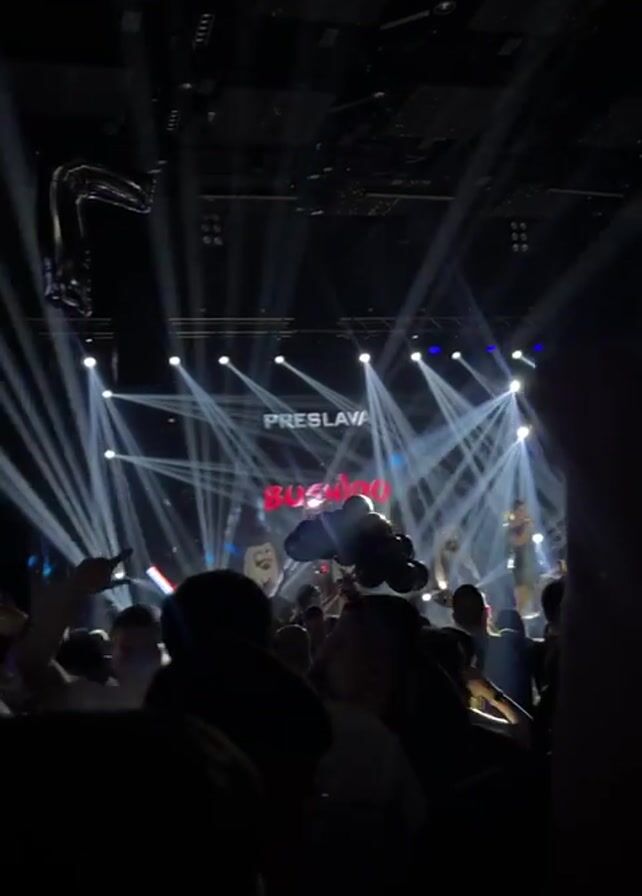 Here is a brief description of the video: The video shows a crowded venue during a performance. There are stage lights shining down on the audience and performer. A screen in the background displays what appears to be a live feed of the show or event. The crowd is mostly comprised of people who are raising their hands and cheering. The overall environment seems dark and energetic. There are black balloons in the air and the name "Preslava" appears on the stage backdrop.