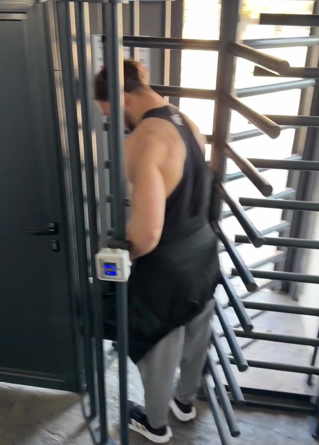 A man is shown from the back, in a gym. He wears a black tank top and grey patterned pants and has a black jacket tied around his waist. The man swipes a card to access a metal turnstile, which he then pushes through. He has a compass tattoo on his right shoulder blade.