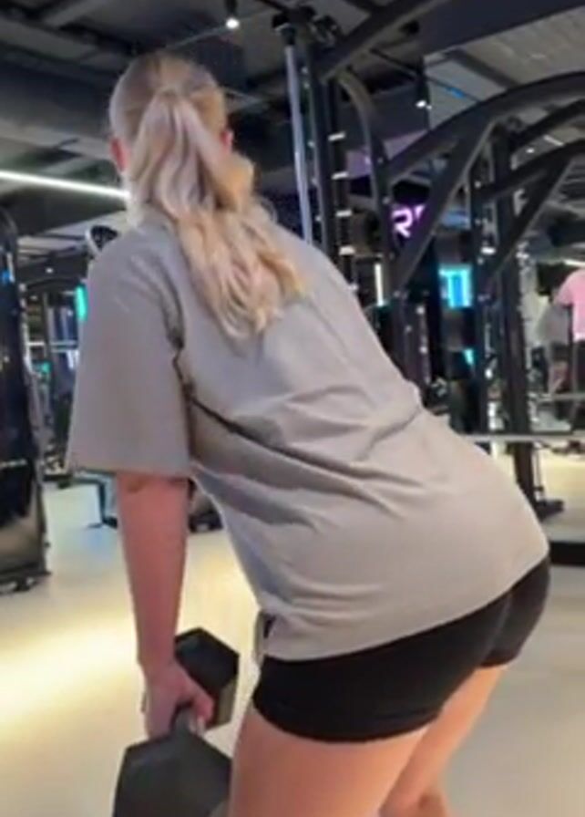 A woman in a gym, seen from the back, performs dumbbell rows