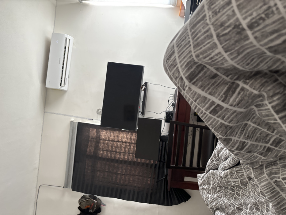 The image depicts an indoor scene in Komchén, Mexico, observed from a low, seated or lying perspective, with the knees of an individual covered by a gray and white patterned blanket dominating the immediate foreground. In the mid-ground, a dark reddish-brown wooden desk is positioned against a plain white wall. A dark chair with horizontal slat backing is placed in front of the desk. Above the desk, a larger, dark-screened flat-panel monitor is wall-mounted. A smaller, dark-screened monitor rests directly on the desk surface below it. Various cables and computer peripherals are visible on and around the desk. To the left of the desk, a dark brown pleated or cellular blind covers a window, allowing some diffused light to penetrate. Two baseball caps are hung on hooks on the wall to the left of the blind. In the background, a white mini-split air conditioning unit is mounted high on the right-hand wall. A narrow vertical window with white framing is visible on the far right, admitting natural light. White cable raceways are affixed to the top portion of the wall. The walls are uniformly white. No individuals are fully visible, only the implied presence of the person taking the photograph. The overall environment suggests a functional home office or bedroom.