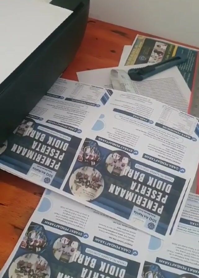 cluttered wooden desk with a black printer on the left. Multiple printed sheets of paper are scattered across the desk, all featuring the same design: a document labeled "PENERIMAAN PESERTA DIDIK BARU" ("New Student Admissions") with an image of children, details about the school (SDQ An Najah), and sections about registration requirements and procedures. To the right of the papers, there are other office supplies including a blue binder, a utility knife, a metal ruler, and more documents. The camera slightly pans to the right, keeping the focus on the papers. A voice is heard in the background asking for a PDF version of the document.