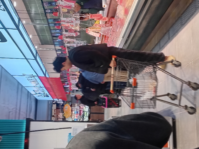 - "In a grocery store, a person wearing a black jacket and blue shirt pushes a shopping cart down an aisle" by FM-a7IaQ2, licensed under CC BY 4.0