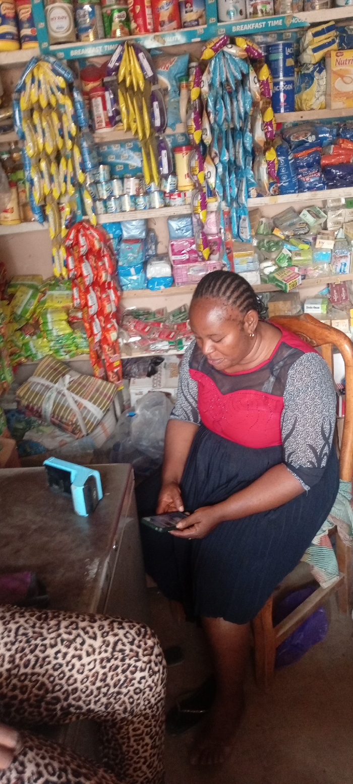 A woman with braided hair sits on a wooden chair, looking at her phone in a small shop. She wears a red and black dress. Shelves behind her are stocked with groceries and goods, including hanging packets of snacks. A blue object sits on a table beside her. Another person wearing leopard print leggings is partially visible in the lower-left corner of the image.