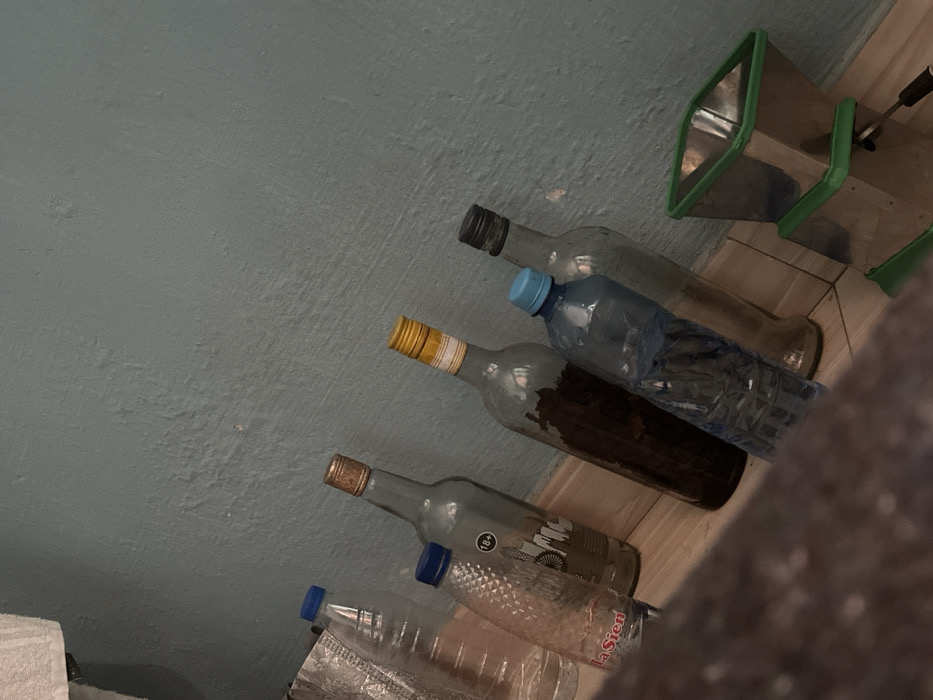 The scene depicts an indoor area, specified as Uyo, Nigeria, featuring a light blue-grey textured wall meeting a light brown tiled floor. A dark, blurred horizontal object partially obscures the lower left foreground. Arranged on the floor against the wall are six bottles and one kitchen appliance. From left to right: 1. A clear plastic bottle with a blue cap, partially concealed by crinkled, metallic-sheen material. 2. A smaller, clear plastic bottle with a blue cap, featuring a textured pattern and the visible label "La Sien". It contains a clear liquid. 3. An empty, clear glass bottle with a brass-colored screw cap. A partial label displays "18+" and an indistinct graphic. 4. A clear glass bottle with a yellow and white striped screw cap, containing dark brown, granular material at its base. 5. A clear blue plastic bottle with a light blue cap, containing clear liquid. 6. An empty, clear glass bottle with a dark grey screw cap. To the far right, on the tiled floor, rests a silver-toned metallic manual grinder or mincer, identifiable by its square hopper and green plastic base and crank handle mechanism. The area is dimly lit. No individuals are present, and no active interactions are depicted.