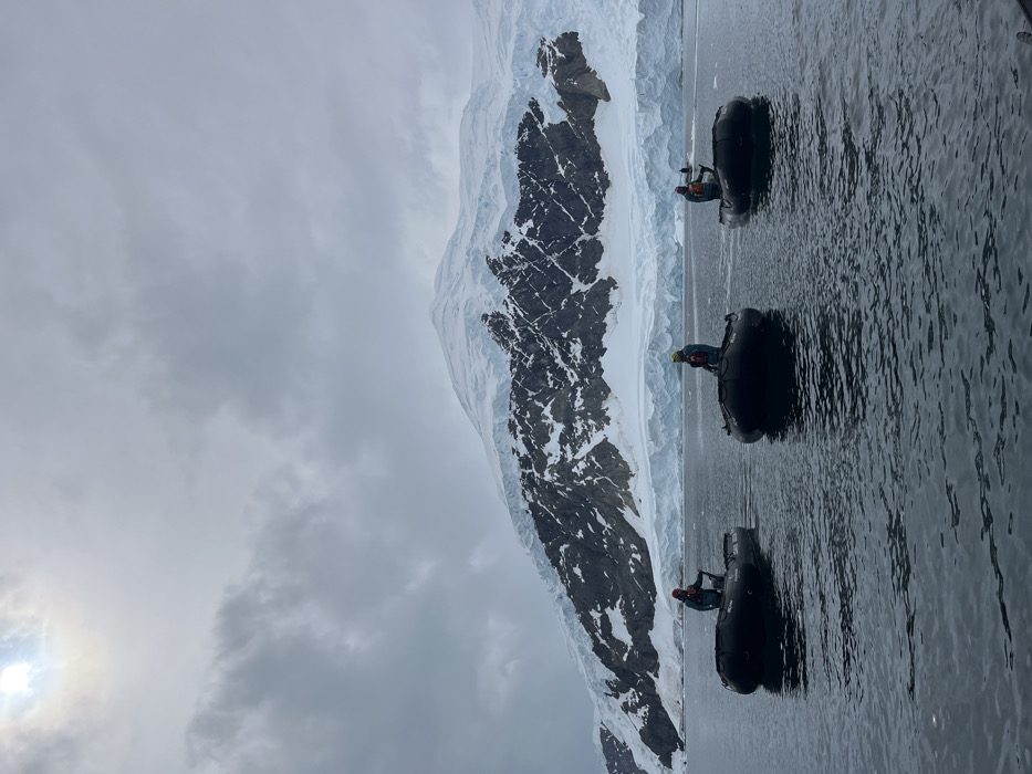 Three black inflatable boats, each carrying one or two people, navigate dark water near a snow-covered mountain with exposed rocky areas. The sky is overcast, with the sun dimly visible through the clouds on the left. The landscape suggests a polar or glacial region. The scene appears cold and possibly remote.