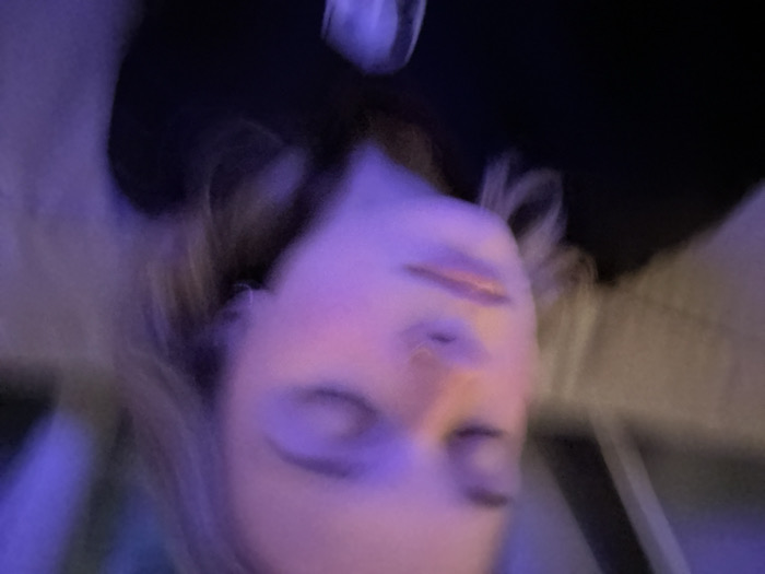 The image is a blurry, close-up shot of a person's face. The individual appears to be lying down, with the camera positioned at an angle. The lighting is predominantly purple and somewhat dim. The person's eyes are closed, and only the nose, mouth, and chin are partially visible. The background is indistinct, but seems to include fabric or clothing, as well as dark shadowy areas.