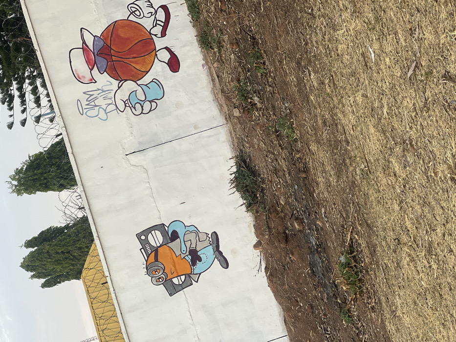A white concrete wall is decorated with graffiti art. The upper image features a basketball character with arms and legs wearing sneakers and a backwards baseball cap. The words "Slam Dunk" are written beside the character. Below, a blue and orange character is drawn holding a boombox. Trees and razor wire are visible in the background. To the right of the wall, there is dry grass.