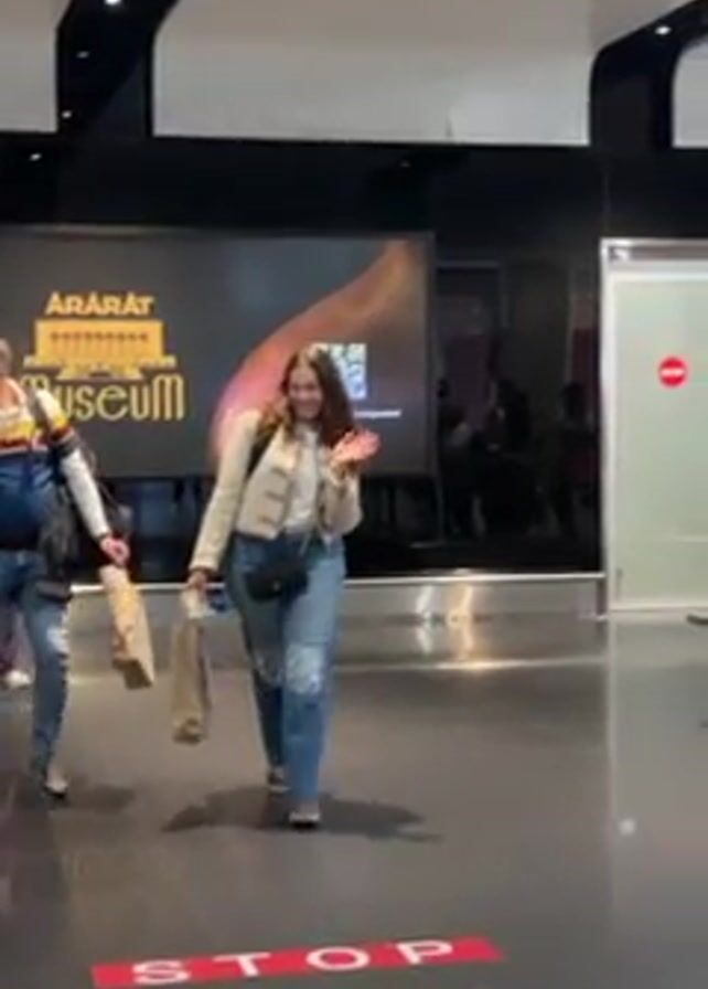 A young woman walks toward the camera, waving. She is wearing a cream-colored jacket, blue jeans with a floral design, and a black purse. She smiles and laughs as she gets closer. Behind her, a man walks to the side, carrying shopping bags. A sign for the Ararat Museum is visible in the background. A red “STOP” sign is on the floor in front of the woman.