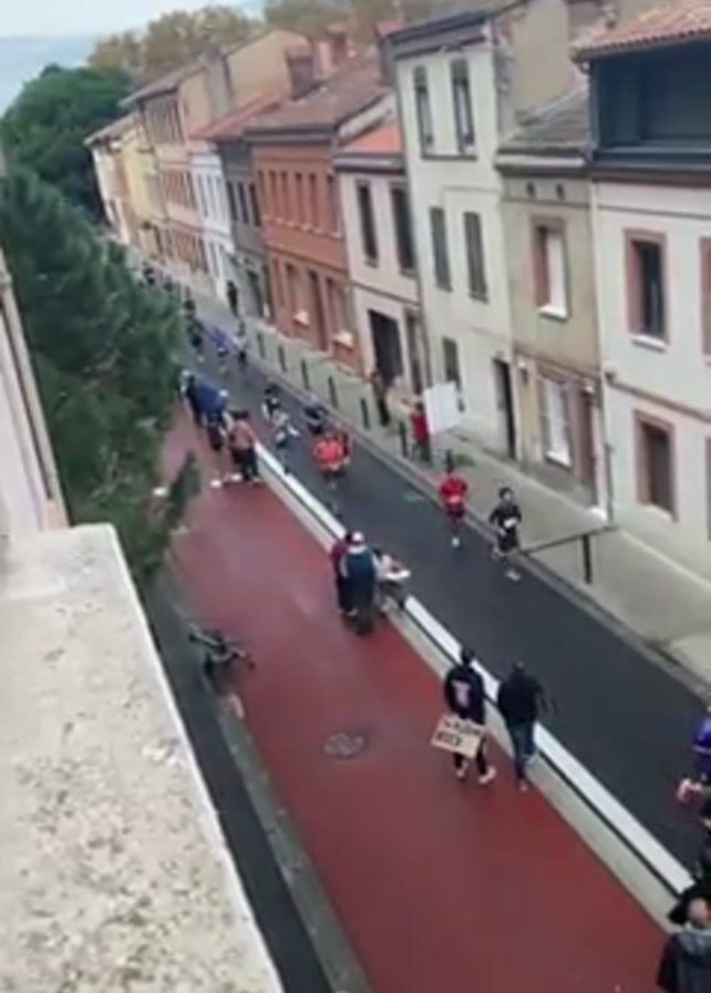 From an elevated perspective, the video captures a street scene lined with colorful buildings. A marathon is taking place, with numerous runners passing by. A red lane is visible on the side of the road, and spectators line the street, cheering the runners on. In the background, trees and park-like spaces can be seen. The weather appears overcast.