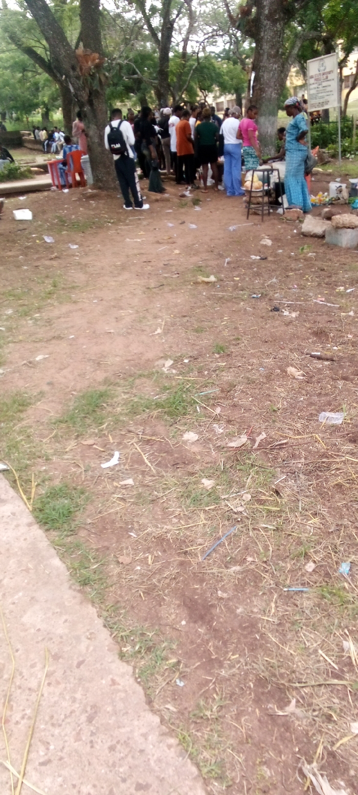 scene of a gathering of people, likely at a market or food stall, in an open space in Okigwe, Nigeria