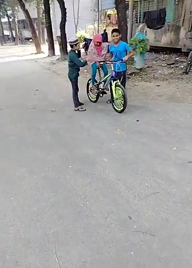 three children interacting with a bicycle on a paved road. The child in the middle, wearing a pink hijab, is sitting on the bicycle with the boy in a blue shirt standing behind, seemingly helping her. Another boy is standing beside the bike, holding onto it. They are on a gray paved road with trees on the side. Behind them is a dilapidated building with clothes hanging out to dry. There is another bicycle parked next to the building. An older woman is walking in the background carrying greens.