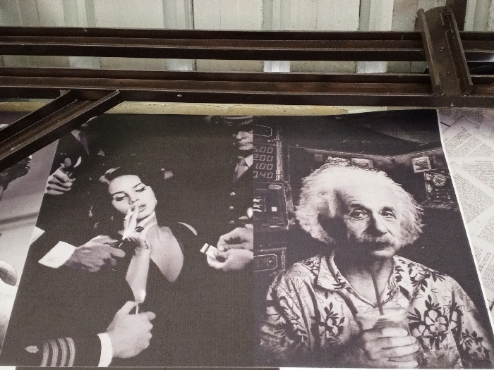 In the city of Voa Yeav, Cambodia, a large, rectangular black and white printed image, resembling a poster or canvas, lies horizontally on a light-colored surface, possibly a floor or workbench. Above the print, three parallel dark metal beams or tracks are visible, running horizontally across the upper portion of the frame, with an additional angled beam fragment protruding from the left. The print itself is divided into two distinct scenes. On the left, a dark-haired woman, depicted in a low-cut dress, has her eyes closed and head tilted back, exhaling smoke from a cigarette. Multiple male hands surround her; two hands, one with a captain's uniform sleeve, hold lighters near her cigarette, while other hands in suits appear to hold small firearms pointed in her vicinity. The right side of the print features an elderly man with wild white hair and a prominent mustache, identifiable as Albert Einstein, wearing a patterned, short-sleeved shirt. He is looking forward, holding a cup with a straw in his right hand. The background behind him contains various mechanical or electronic devices with numerical displays, showing values such as "5.00," "2.00," "1.00," and "1.40." Scattered, light-colored paper with text is partially visible to the right of the print.