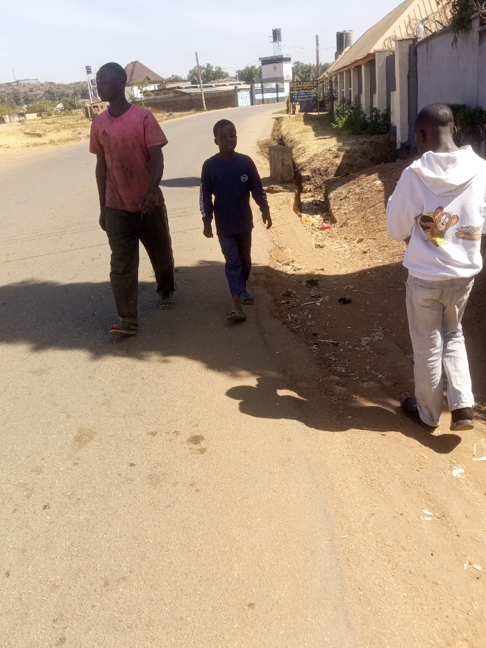 The image depicts an outdoor scene in Bukuru, Nigeria, under bright daylight