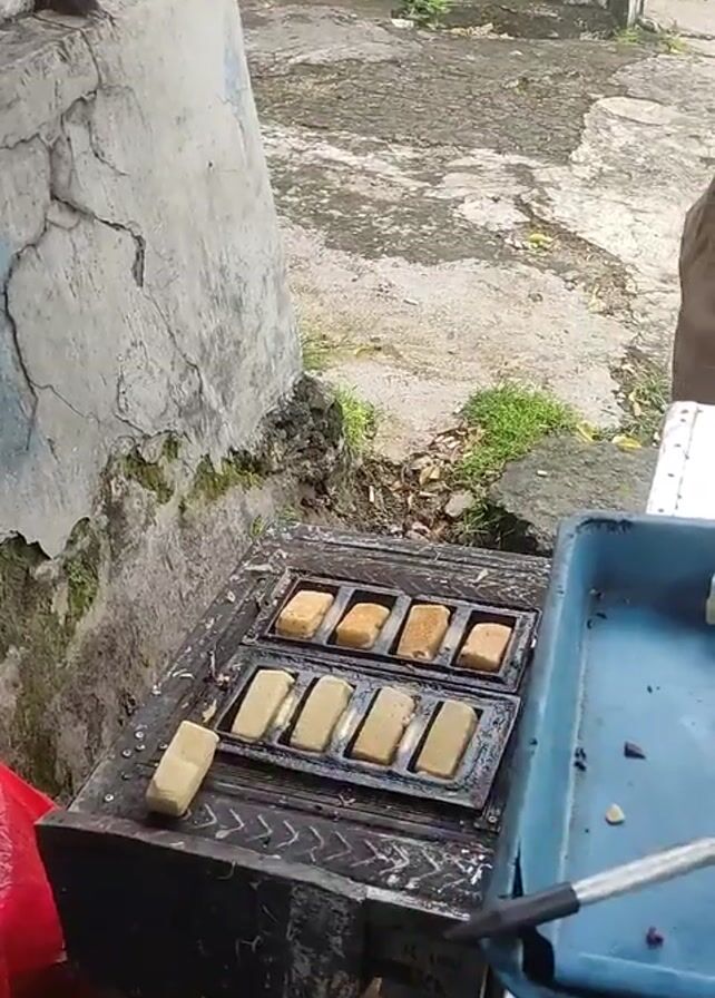 person selling street food. The street food is being cooked in a metal tray with rectangular divisions. Some of the food is golden brown and some is light colored. The vendor uses a small metal spatula to maneuver the food. He hands one of the snacks to a customer who is wearing a helmet and face mask. The vendor is standing next to a concrete wall with moss. A motorcycle is parked in the background.