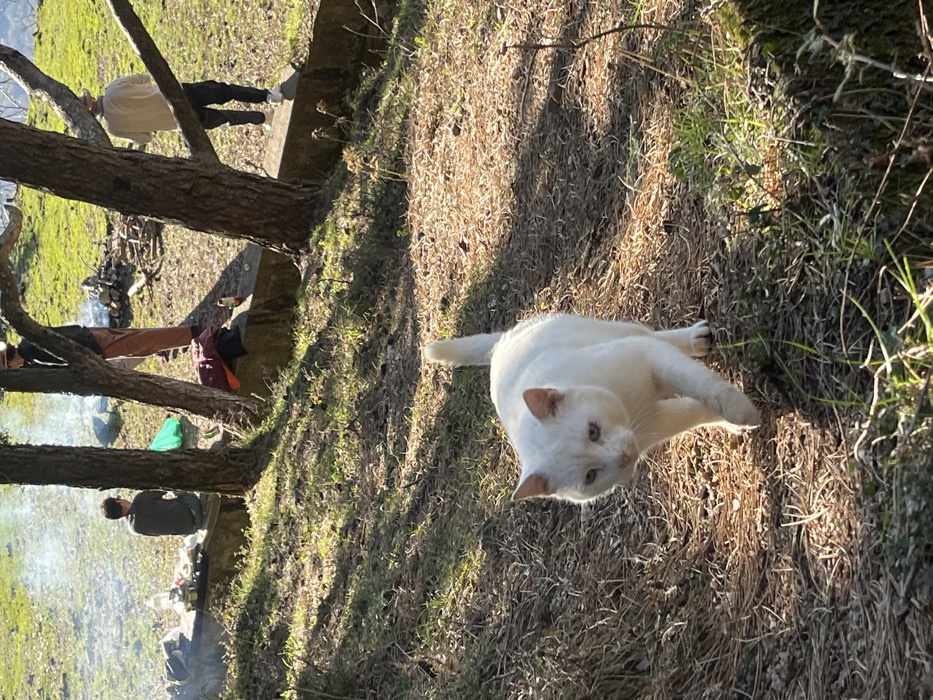 The image depicts an outdoor scene in Kavač, Montenegro. In the foreground, a white short-haired cat with light-colored eyes walks towards the viewer on a path composed of dry grass and scattered pine needles, illuminated by sunlight. Its tail is raised. In the midground and background, three individuals are present in a grassy area with several trees. To the left, a person wearing a grey long-sleeved shirt and dark pants is seated on a low concrete ledge or wall, facing away from the camera. Items, including a water bottle and possibly cooking implements, are arranged on the ledge near this individual. Behind this person, a faint plume of smoke rises, indicating a small fire or cooking activity. To the right of the seated individual, a second person wearing a dark top, light brown pants, and a straw-colored hat stands near a tree, partially obscured. Further to the right, a third person wearing a light-colored long-sleeved top, dark pants, and a hat is seen standing behind another tree, moving away from the camera. A pile of cut wood, possibly for a campfire, is visible in the distant background. Sunlight casts distinct shadows across the scene from right to left.