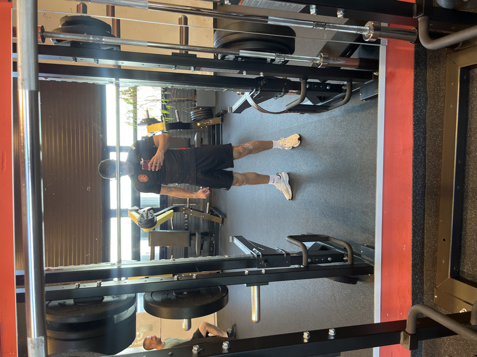 The image depicts an indoor fitness facility, specifically a modern gym located in Sofia, Bulgaria. In the center, a male individual is taking a mirror selfie. He is standing, facing the large mirror, holding a black smartphone in his raised right hand. He wears a black short-sleeved athletic shirt with a red and gold emblem on the left chest, black athletic shorts, and white athletic shoes with white socks. Light-colored patches are visible on both of his lower thighs/knees. To the left, reflected in the mirror, another male individual is partially visible, seated on a piece of gym equipment. He wears a light-colored short-sleeved shirt and dark shorts, with a smile on his face. The foreground is dominated by the black frame of a Smith machine, into which the primary mirror is integrated. Heavy black weight plates are loaded onto the barbell rack on the left side of the Smith machine. The floor is covered with dark grey interlocking rubber gym mats, bordered by a red stripe at the base of the walls. The background shows additional gym equipment, including various strength training machines with black frames and yellow accents. Large windows along the back wall provide natural illumination, with some sections covered by horizontal blinds. A potted green plant is positioned near the windows.