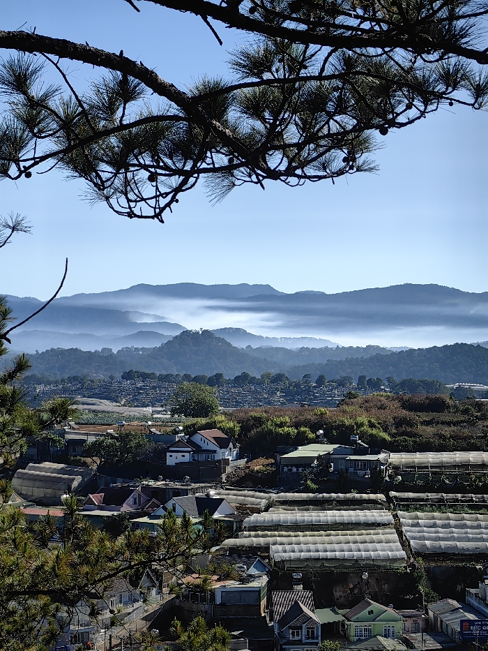 Hills shrouded in mist create a backdrop to a town nestled in a valley. Homes and greenhouses fill the foreground, with dark green foliage surrounding them. Pine tree branches frame the scene overhead, silhouetted against a bright blue sky. The overall impression is one of serenity and natural beauty.