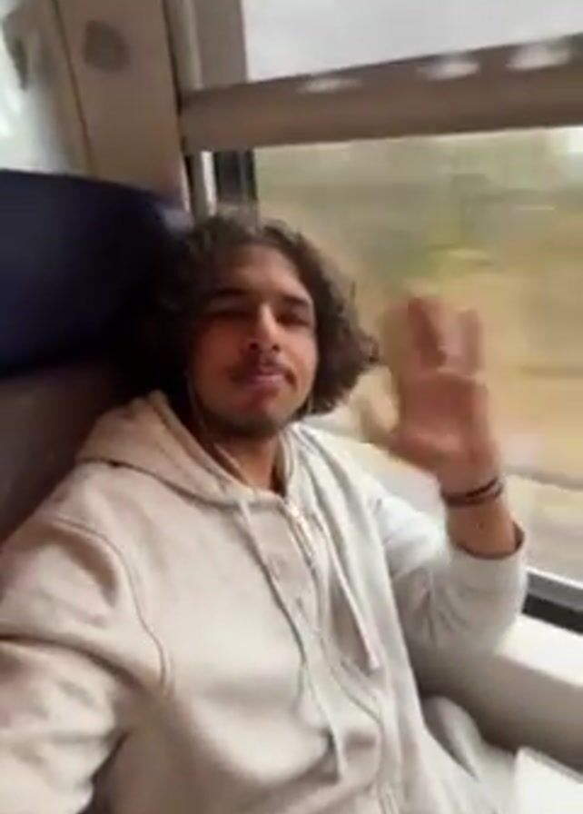 A person is sitting in a train. The person is wearing a light-colored hoodie and has curly hair. The person is looking at the camera. The train is moving, and the view outside the window shows a landscape of fields and trees under a cloudy sky. The train window has some raindrops on it.