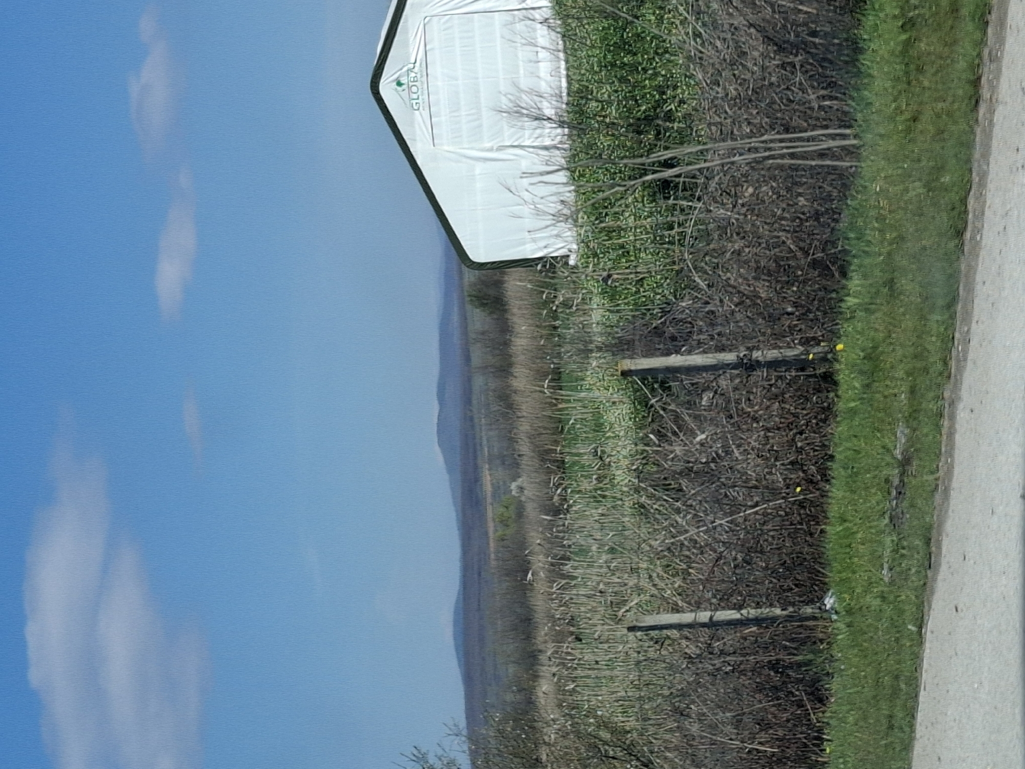 A horizontal shot depicts a rural scene. A white tent-like structure labeled "GLOBA" is set against a backdrop of dried vegetation and a distant mountain range under a blue sky with scattered clouds. In the foreground, there's a grassy verge with a concrete road edge. Two wooden fence posts are visible amidst the overgrown brush. The location is in the vicinity of Shtarkovo, Bulgaria.