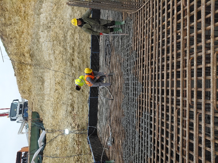 This image captures an active construction site in Sidi Moussa Ben Ali, Morocco. The scene is dominated by a concrete pouring operation. In the foreground, a dense grid of steel rebar reinforcement is visible, with sections in the mid-left covered by recently poured dark grey concrete. Three male construction workers are present. The central worker, clad in a yellow hard hat, a bright yellow reflective vest over dark clothing, and an orange harness, is actively operating a concrete vibrator, inserting it into the wet concrete to consolidate it. To his right, another worker, wearing a yellow hard hat, a dark green jacket, dark trousers, and green rubber boots, stands holding a long-handled tool, possibly a shovel or screed, vertically. A third worker is partially visible on the far left, wearing green boots. Behind the workers and the concrete pour area, a dark, possibly waterproof, lining or formwork is installed. A bright work light illuminates this section of the site. The background features a large, excavated earthen embankment showing distinct geological strata. On top of this embankment, a white XCMG concrete pump truck with its boom extended and another piece of heavy machinery (partially visible) are positioned, indicating ongoing concrete supply. The sky is overcast.