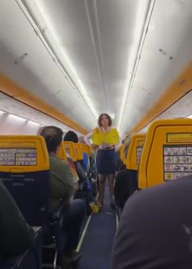 interior of an airplane cabin. The aisle is visible, with rows of yellow seats on either side. Passengers are seated, facing forward. A flight attendant stands in the aisle, facing the camera and addressing the passengers. She is wearing a yellow shirt, a blue skirt, and a life vest. She is holding a life vest and demonstrating its use. An "EXIT" sign is visible above her.