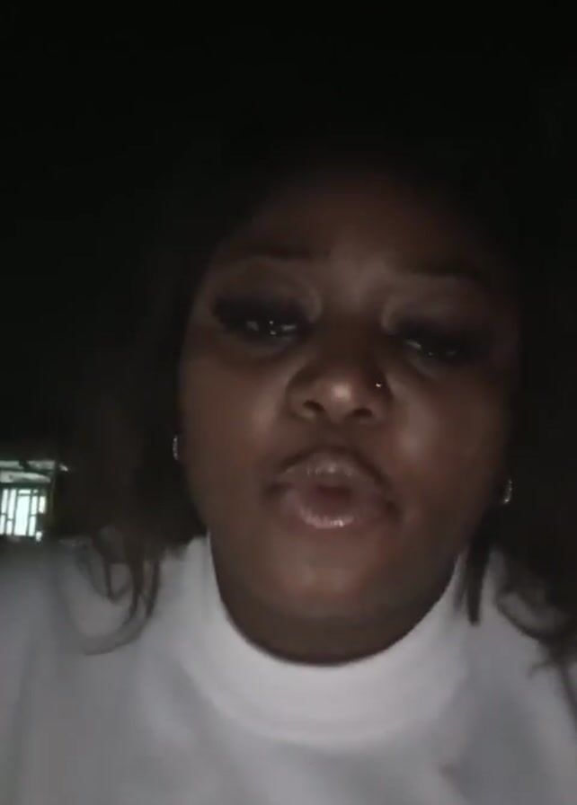 A woman with medium brown skin, dark hair, and dark eye makeup looks directly into the camera. She is wearing a white, mock-turtleneck shirt. The video is shot at night, and the background is dark, though a streetlight can be seen briefly in the upper left corner. The woman speaks and moves her hand near her face.