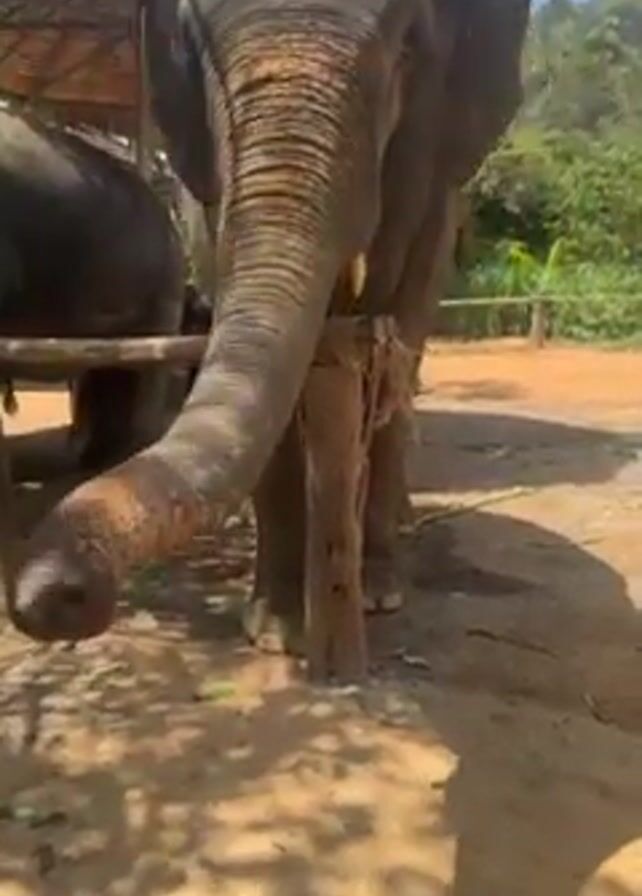 close-up view of a large elephant eating green leaves. The elephant is tethered by its front legs to a wooden structure. The elephant’s trunk is visible, and it uses its trunk to grab and eat the leaves. The elephant has small tusks. Another elephant is partially visible in the background, under a thatched roof structure. The ground is dirt and shaded. The scene appears to be a sanctuary or protected area for elephants.