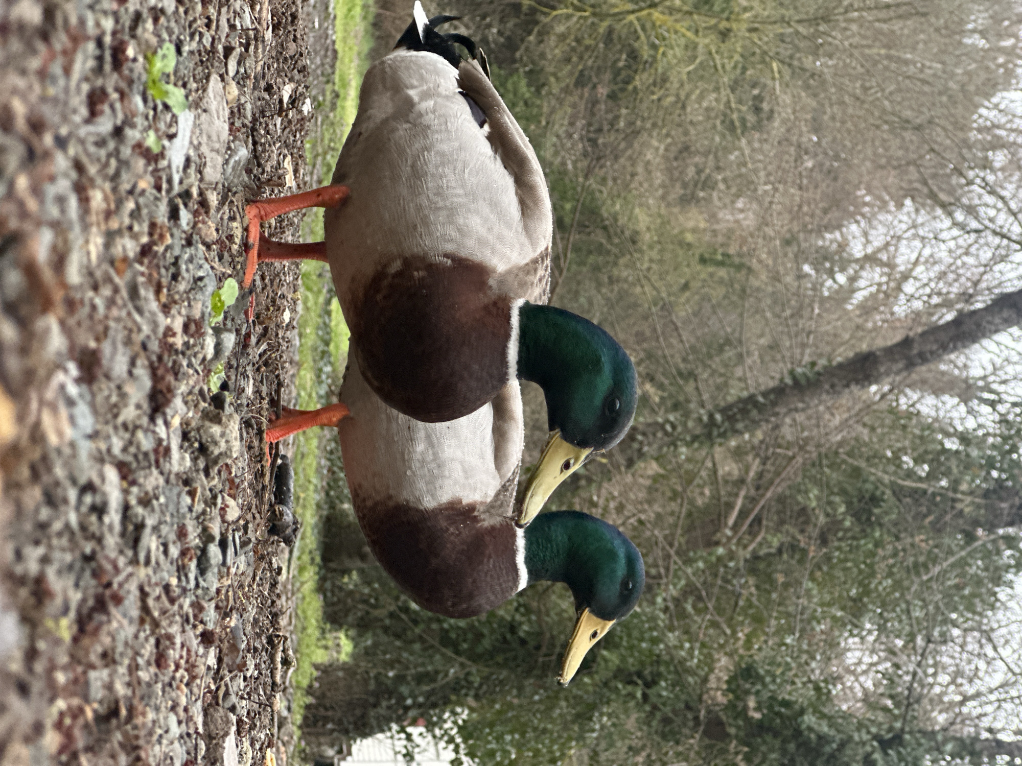- "Two male mallard ducks stand side-by-side on gravel and leaf litter" by FM-TkCi72, licensed under CC BY 4.0