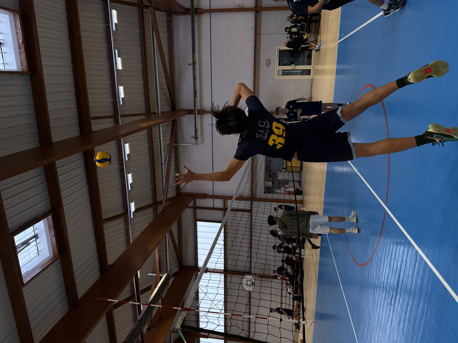 An indoor gymnasium in Sennecey-le-Grand, France, hosts a volleyball match. The central figure, a male athlete wearing a dark blue "SLC Volley-Ball 39" shirt, dark shorts with light trim, dark socks, and athletic shoes, is captured mid-jump, left leg bent, right arm fully extended upward toward a yellow and blue volleyball suspended above him. He appears to be attempting a spike or serve. A black volleyball net with a white top band and a red-and-white striped antenna segment extends across the frame behind him. The court floor is blue with white and red demarcation lines. In the background, other male players in athletic wear are visible on both sides of the net; some stand on court, while others gather near benches on the left or by a white door on the right. A basketball hoop is visible in the far left background. The facility features a high ceiling with exposed wooden structural beams, corrugated metal panels, rectangular fluorescent lighting fixtures, and several skylights.