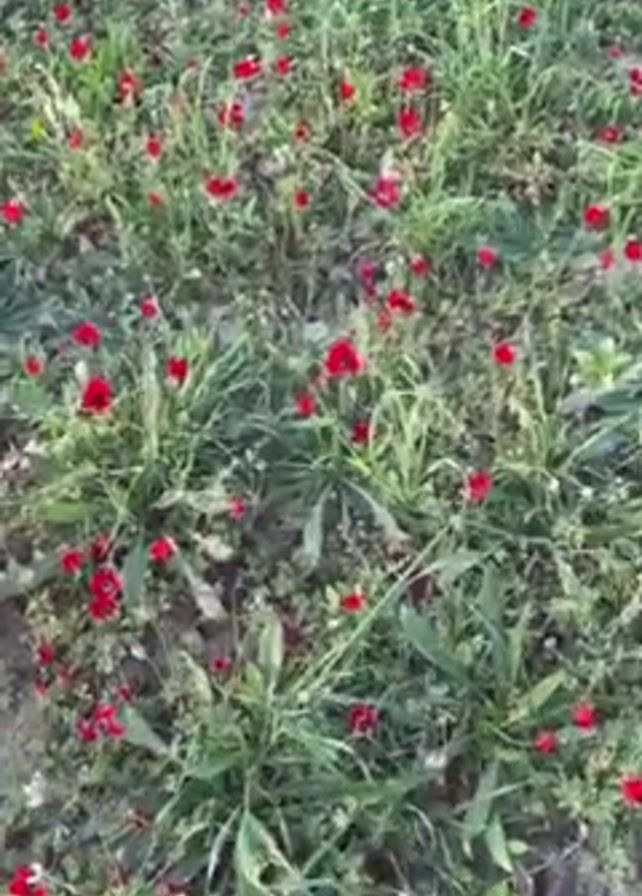 field of wild red anemone flowers interspersed with green grasses and weeds