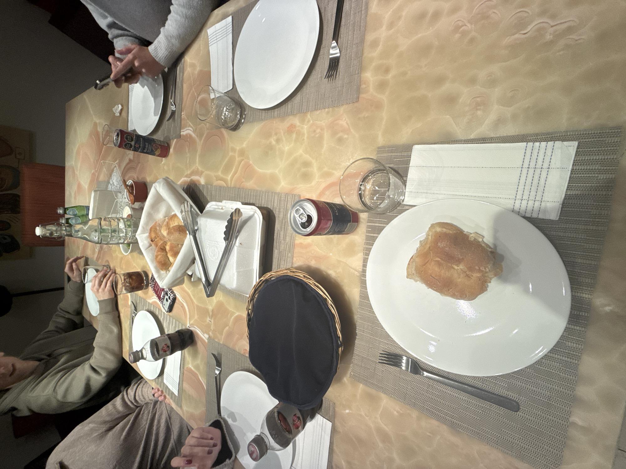 Four individuals are gathered around a light-colored, possibly onyx-patterned dining table indoors in San Bernardino Tlaxcalancingo, Mexico. The table is set with multiple placemats, white oval plates, silverware, and clear drinking glasses. From left to right, partially visible figures include: a person in a light, long-sleeved garment with pink-polished fingernails; a person in a khaki hooded sweatshirt; and a person in a light grey long-sleeved garment actively using a silver-colored smartphone. A fourth person is implied by the foreground place setting. Objects on the table include: - In the foreground, a white oval plate holds a single golden-brown bread roll next to a silver fork and a clear glass on a grey placemat with a folded white napkin. - Towards the middle, a small glass bottle of Coca-Cola (Mexican origin visible) and a white oval plate are next to a smartphone with a leopard-print case. - A large wicker basket with a dark blue cloth lid, a white basket containing multiple croissants or similar bread rolls, and a white rectangular takeout container with silver tongs are centrally placed. - Beverages include a large clear glass bottle of water, two small green San Pellegrino bottles, a partially consumed red and silver San Pellegrino sparkling beverage can, and several glasses containing clear liquid or a dark beverage with ice. - Small red condiment bowls are also visible. - Crumpled white paper is near the smartphone.