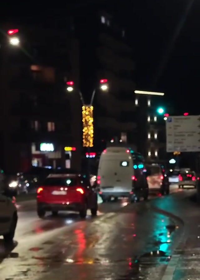 city street at night. The street is wet from rain, and the lights from cars and street lamps reflect on the pavement. Several cars, including a red one, and a white van are waiting at a traffic light, which is green on the right side of the street. Buildings line the street, some with lit windows. A vertical string of golden lights hangs above the street. The video is slightly out of focus.