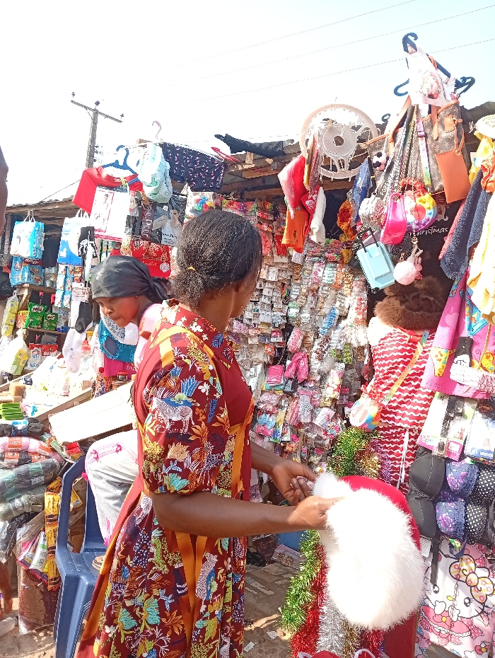 The image depicts an outdoor market stall in Onitsha, Nigeria, under bright daylight. In the foreground, an African woman, facing right and slightly away from the camera, wears a reddish-brown dress with a complex, multicolored print featuring animals and foliage. She holds a red and white Santa hat with white fur trim and a pompom, along with green and silver tinsel. To her left and slightly behind, a second African woman, wearing a dark headwrap, is partially visible, appearing to attend to merchandise. The market stall is densely stocked with various items. Prominently displayed are an assortment of apparel, including bras (some patterned, some plain black), baby clothing (including a red-and-white striped garment), and numerous accessories such as handbags (one resembling a Louis Vuitton pattern, a small light blue suitcase-shaped bag, a pink heart-shaped bag), scarves, and small packaged trinkets or hair accessories on cards. A white circular fan hangs among the goods, and a small sign reading "Merry Christmas" is visible. On the far left, shelves hold stacked packaged goods. The overall stall structure appears rudimentary, with items suspended from hooks and displayed on shelves. The ground is unpaved, showing exposed dirt. In the upper left background, a utility pole with electrical wires is visible against a bright, clear sky.