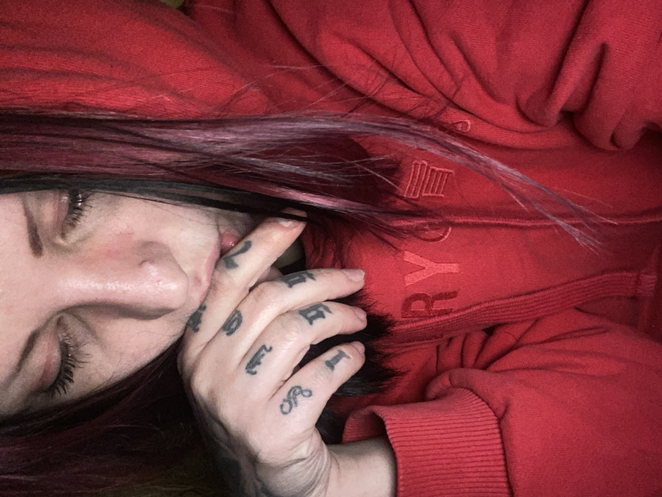 A person lies on their back, wearing a red hoodie. Their eyes are closed, and their fingers, adorned with tattoos, are near their mouth. The person has dark hair with purple highlights. The hoodie has the word "RYC" vertically printed on it. The overall lighting is somewhat dim, casting shadows and giving a slightly moody ambiance.