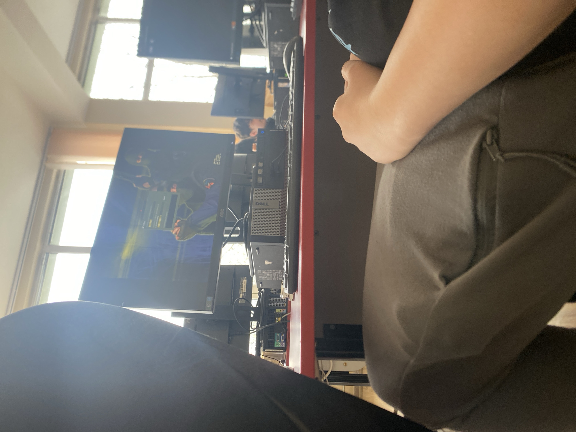 The image depicts an indoor computer lab or classroom setting within the city of Stara Zagora, Bulgaria. The perspective is first-person, looking forward from a seated position behind a dark, curved object, likely a chair back. In the immediate foreground, the lower torso and bent arm of an individual are visible, wearing dark grey/green trousers with a zipper detail on the left thigh, and a dark short-sleeved top. The arm rests on the lap. Directly ahead, a red-topped desk spans horizontally across the midground. On this desk, a black AOC brand computer monitor displays a video game, appearing to be a first-person perspective with a character holding a weapon in a digital environment. To the left of the monitor rests a black Dell desktop computer tower. A black keyboard and mouse are positioned on the desk in front of the monitor. Further left, cabling and the rear ports of another computer, including green, blue, pink audio jacks and yellow USB ports, are discernible. In the background, multiple large windows with white frames and light-colored vertical blinds or curtains are visible, allowing significant natural light into the room. Through these windows, an indistinct bright outdoor environment is present. Further into the room, to the right and slightly behind the main computer setup, another individual with dark hair is partially visible, seated at a separate computer workstation. The overall scene indicates a functional computing environment with multiple stations.