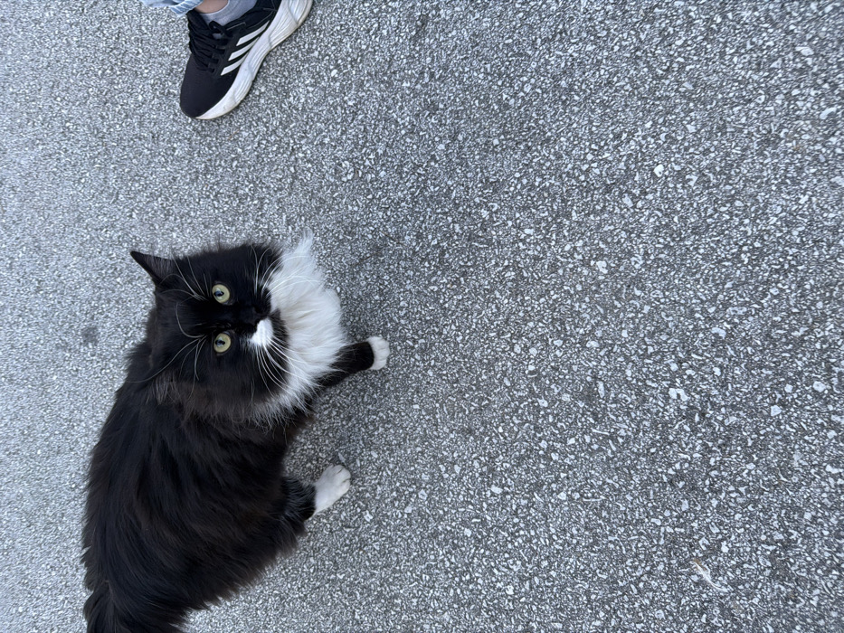 - "In Mihalkovo, Bulgaria, a domestic long-haired cat, primarily black with white facial markings (muzzle and prominent whiskers) and a white bib on its chest, stands on a dark grey granular paved surface" by FM-Yeet12, licensed under CC BY 4.0