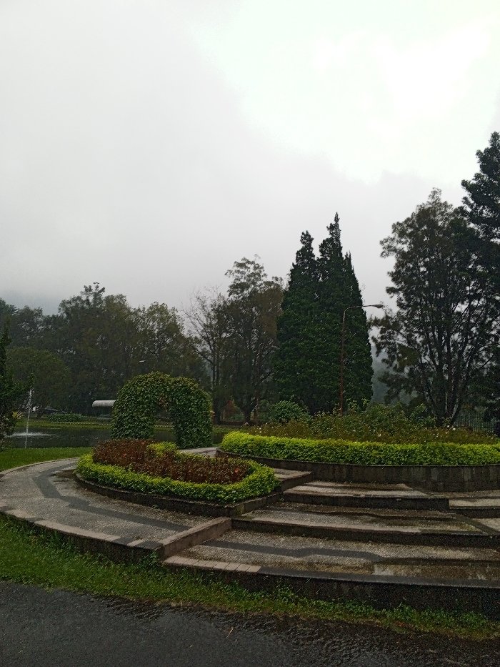 A serene, overcast park setting features a multi-tiered garden bed with steps, encircled by a curving pathway. The garden is adorned with greenery and a lush, vine-covered archway. A pond with a fountain is visible in the background, flanked by trees and shrouded in mist. The paved ground appears wet, suggesting recent rain. The atmosphere is quiet and contemplative.