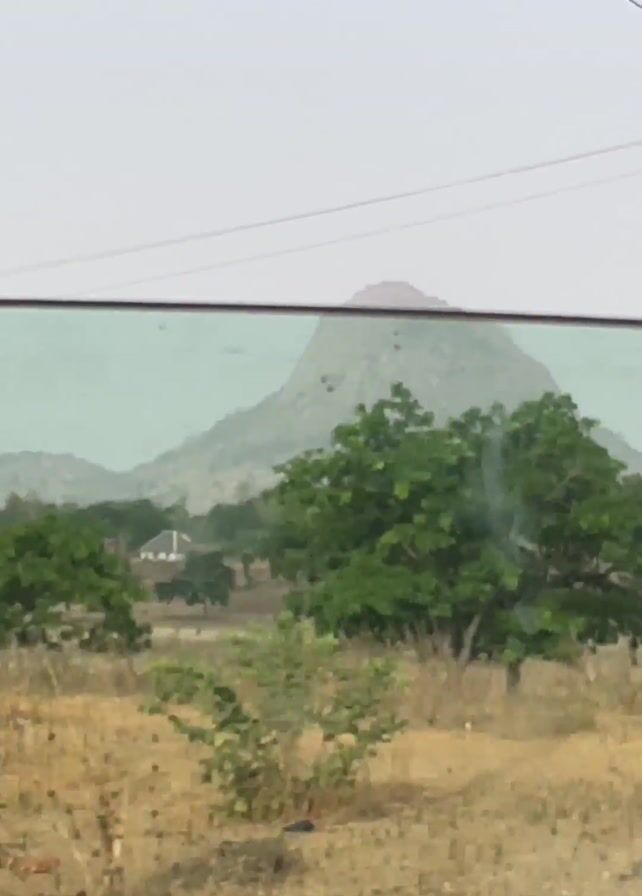 The video, recorded from within a moving vehicle, shows a rural landscape. The first shot includes an electricity pole and a distant mountain, partially obscured by trees and foliage. The view shifts to a young boy in a purple shirt standing near a brick building with a rusty roof. He seems to be facing the road. The next scene shows a man wearing a white tank top and black shorts carrying a yellow container on his head, walking through a field of tall, dry grass.