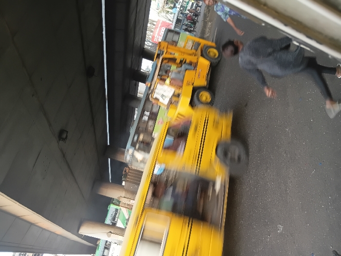 The scene depicts a dynamic urban environment beneath a concrete elevated road in Lagos, Nigeria, strongly suggesting a major transport hub such as Oshodi. A yellow commercial minibus, identifiable as a Lagos 'Danfo,' is prominently featured in the midground, exhibiting significant motion blur as it travels from left to right. Its passenger door is open, revealing a blurred occupant. Adjacent and to its right, a large yellow industrial vehicle, resembling a heavy-duty forklift or specialized loader marked '101' and 'COMMERCIAL,' also proceeds from left to right, with an individual visible in its cabin. In the right foreground, a person in dark attire is in mid-stride, moving from right to left across the asphalt road, partially obscured by a white structure. Behind this person, another individual in a light-colored patterned shirt stands, facing towards the left with an extended arm. The background includes several green 'BRT' buses, indicative of Lagos Bus Rapid Transit, and a red sign displaying 'N5.000'. The road surface is asphalt, and multiple concrete pillars support the overhead infrastructure.