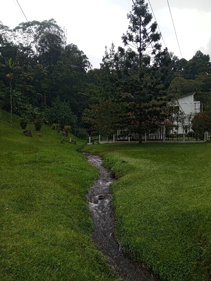 A narrow stream flows through a lush green lawn, cutting a winding path towards a white building with a dark roof. Trees of varying heights and types surround the lawn, forming a natural barrier. Power lines stretch across the top of the frame, adding a contrasting man-made element to the scene. The sky appears overcast.