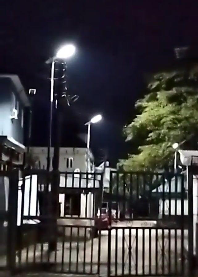 night scene in front of a building enclosed by a metal gate. The camera initially focuses on the gate before panning upwards to show the building behind it. The building is a two-story structure, painted a dark color. Two streetlights illuminate the area, casting light on the building, the gate, and a tree on the right side of the frame. There are no people visible in the frame.