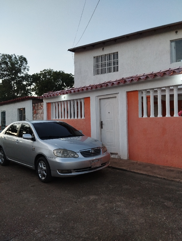 A silver Toyota Corolla is parked on a paved street in front of a two-story house. The house has a white stucco exterior, orange accents, and decorative white columns. A barred window is visible on the second floor. The sky is overcast. Trees can be seen in the background.