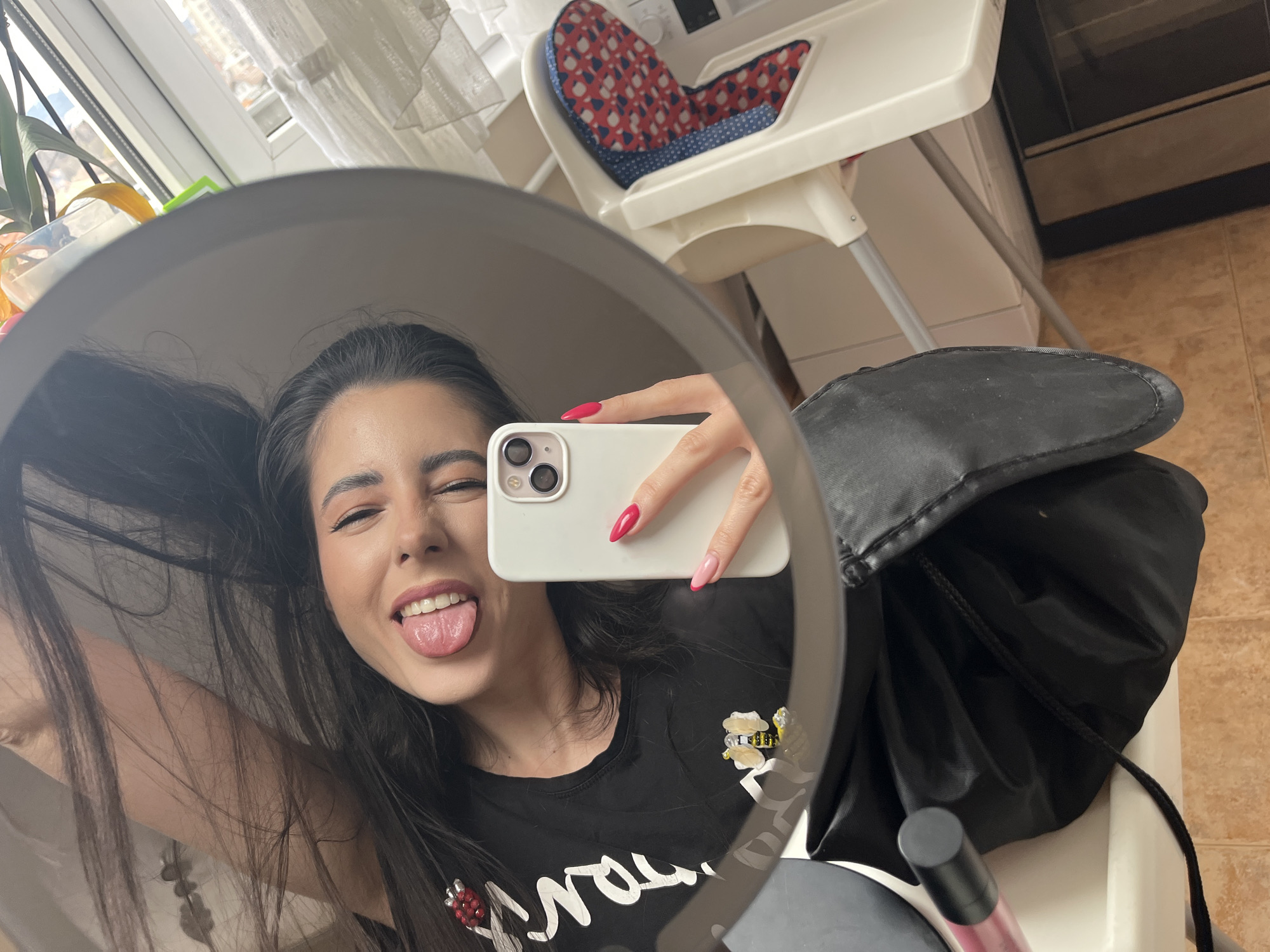 The image depicts a female subject capturing her reflection in a mirror within an indoor residential setting in Pernik, Bulgaria. The female, with long dark hair, has her left eye closed and tongue extended. She wears a black t-shirt with white text, a red cluster embellishment on the upper left chest, and a bee embellishment below the neckline. She holds a white dual-camera smartphone in her right hand; her visible fingernails are painted bright pink, with the ring finger featuring a pink ombré design. The background, visible in the mirror, includes a window with a sheer white curtain overlooking buildings with red roofs and a blue sky. A green-leafed plant in a yellow pot is positioned near the window. To the right, a beige high chair with a blue, red, and white patterned cushion is present. The floor is covered with brown tiles. A black drawstring bag and a pink-capped cosmetic tube rest on a surface below the mirror.