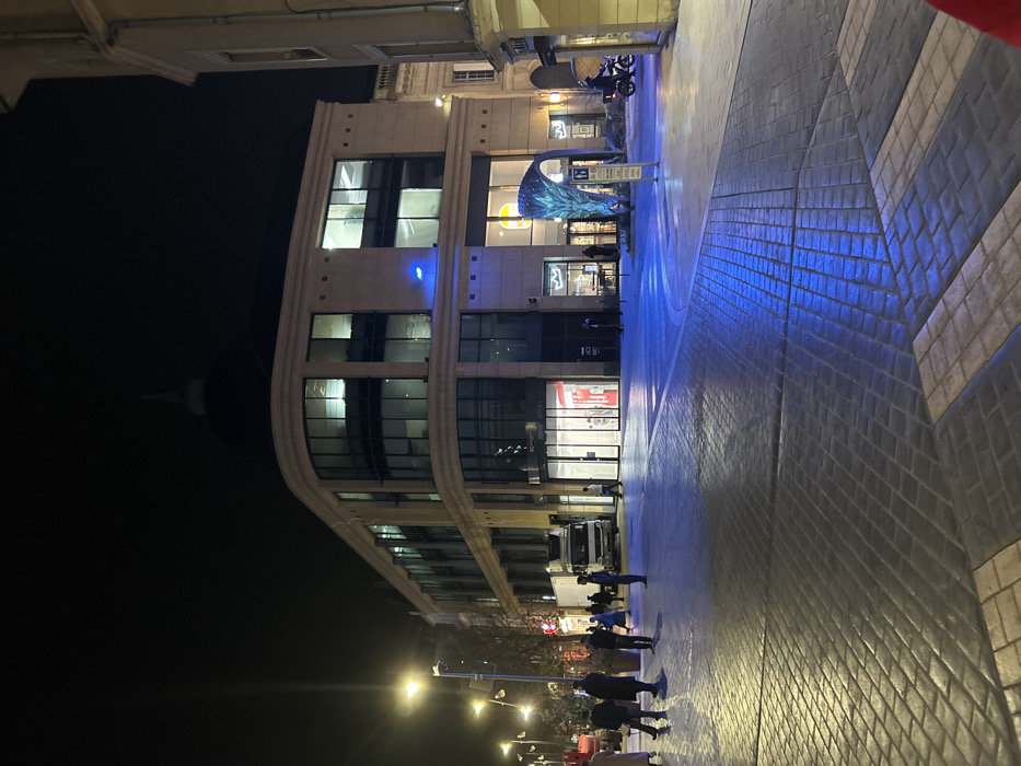 A nighttime shot depicts a street scene with a modern building occupying the left frame. The building is illuminated with lights emanating from its windows and displays. A street or plaza extends from the building into the right frame, paved with what appears to be cobblestones or brickwork, reflecting blue light and shadows. The presence of streetlights is indicated by the light flares near the bottom of the frame. A few people are visible, appearing as dark silhouettes against the brighter foreground.