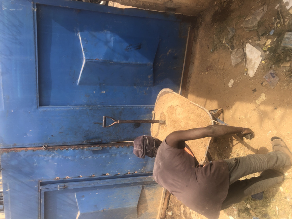 An individual is depicted from the rear, leaning forward over a wheelbarrow in an outdoor setting in Tukur Tukur, Nigeria