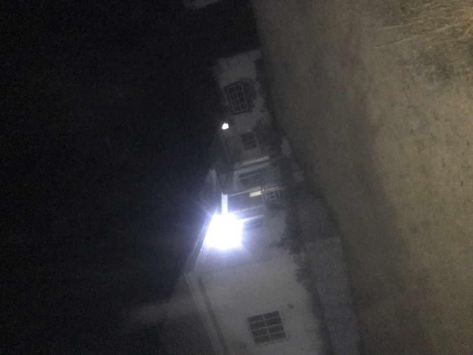 A nighttime perspective shot displays an exterior courtyard of a multi-story building. Windows are visible on the structure. A bright light source illuminates the scene, casting strong shadows and creating a high-contrast image. The right side of the frame is dominated by a concrete or stone wall, adding depth and texture to the setting. The sky or background is enveloped in darkness.