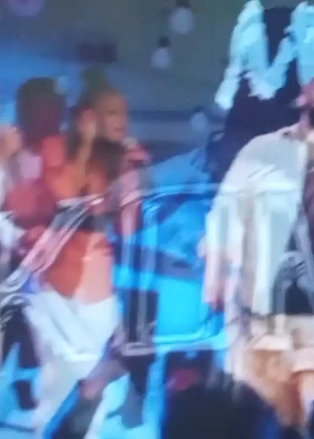concert performance with a group of singers on stage in the first scene, with a large backdrop displaying text