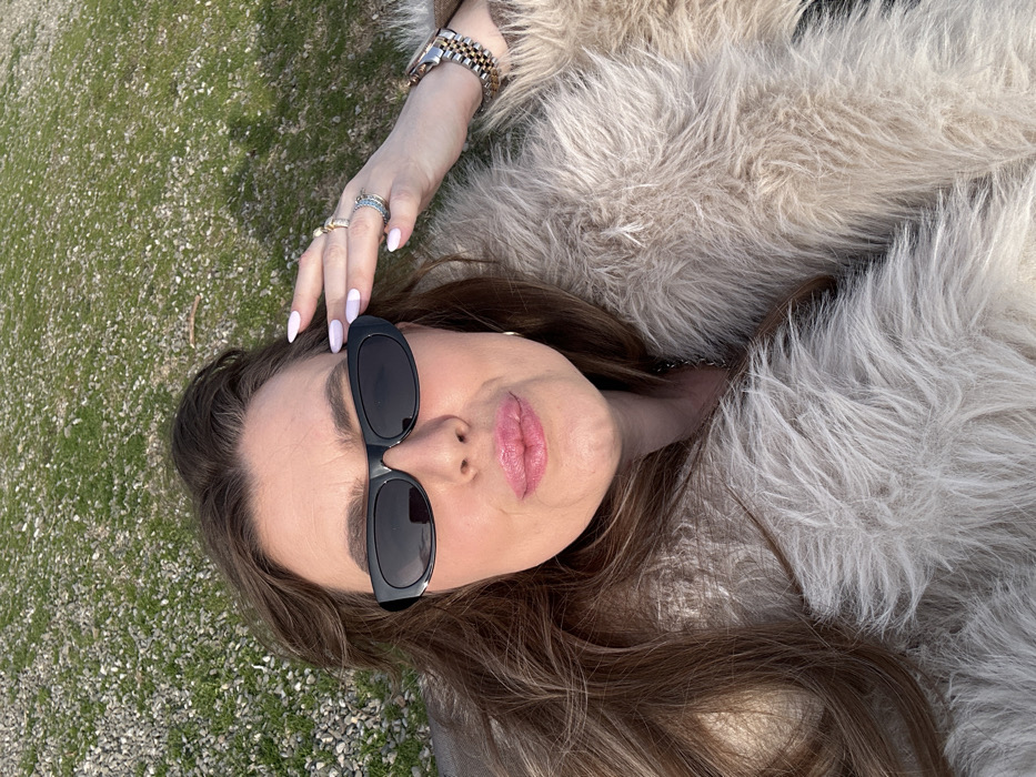 An adult female is depicted in a close-up outdoor selfie, situated within the city of Sighnaghi, Georgia. She has long brown hair and is wearing black oval sunglasses. Her lips are coated with pink lipstick and are slightly puckered. She wears a light-colored faux fur coat; a silver-toned chain is partially visible around her neck. Her right hand, adorned with multiple rings and a two-tone metal link bracelet watch, is raised to touch the frame of her sunglasses. Her fingernails exhibit a light pink and white French manicure. The background consists of green grass interspersed with small grey and white gravel, illuminated by natural daylight.